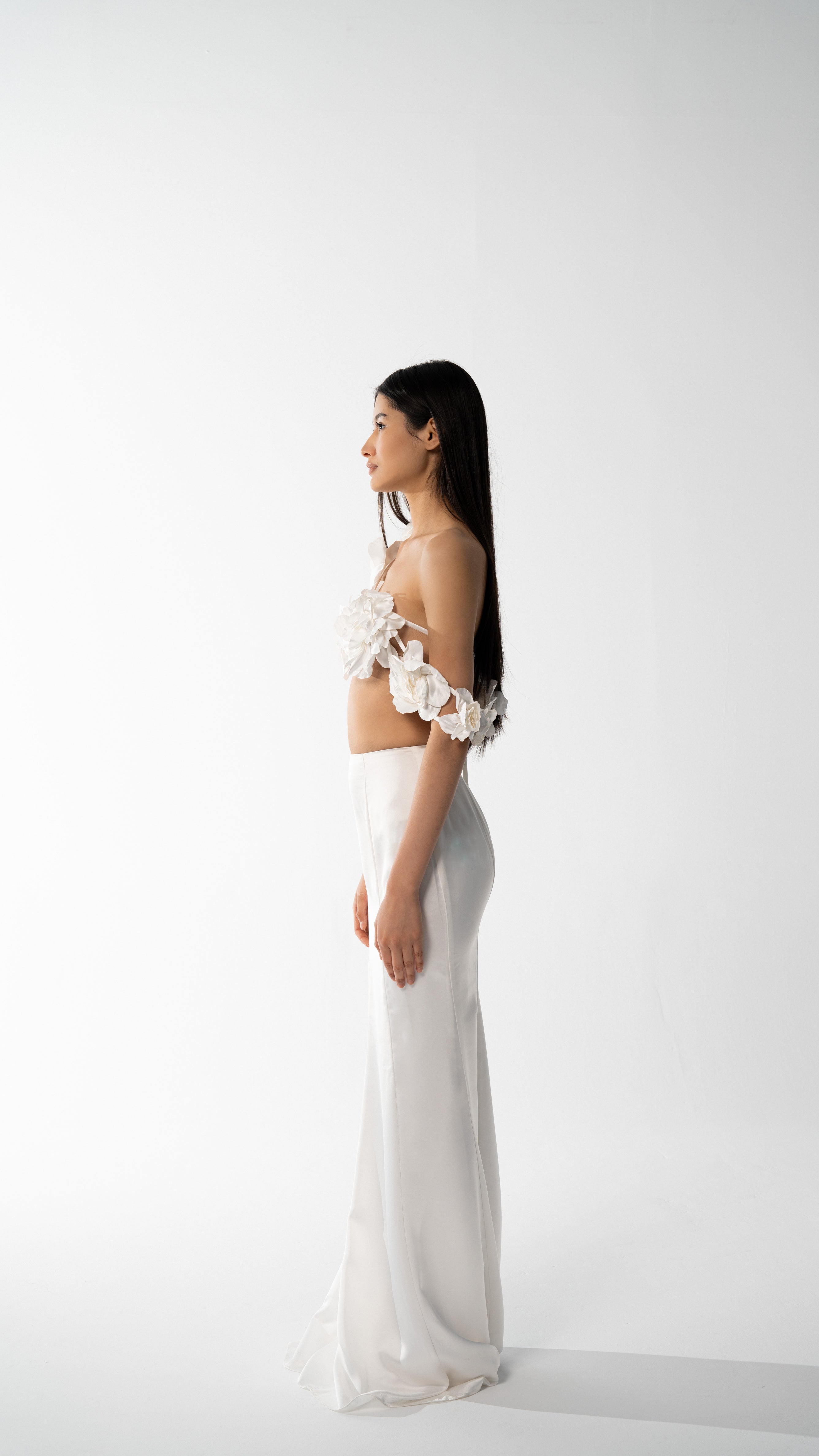 The Rosetta top features handcrafted petals, exuding charm and elegance. Adjustable straps ensure a flawless fit. Paired with a skirt crafted from radiant white satin, this set is designed to make you glow. The mermaid silhouette hugs your curves in all the right places, leaving an unforgettable impression wherever you go.