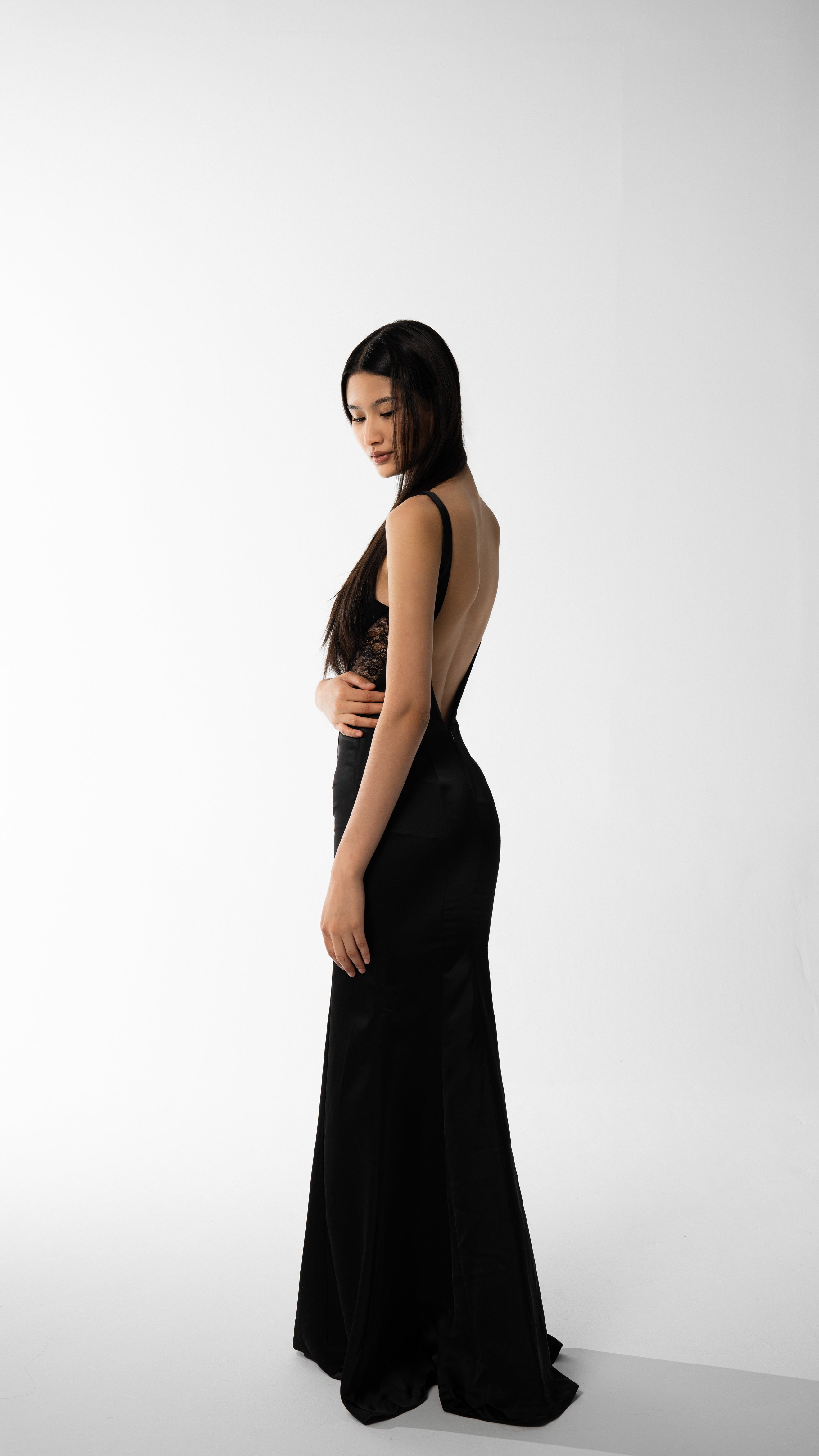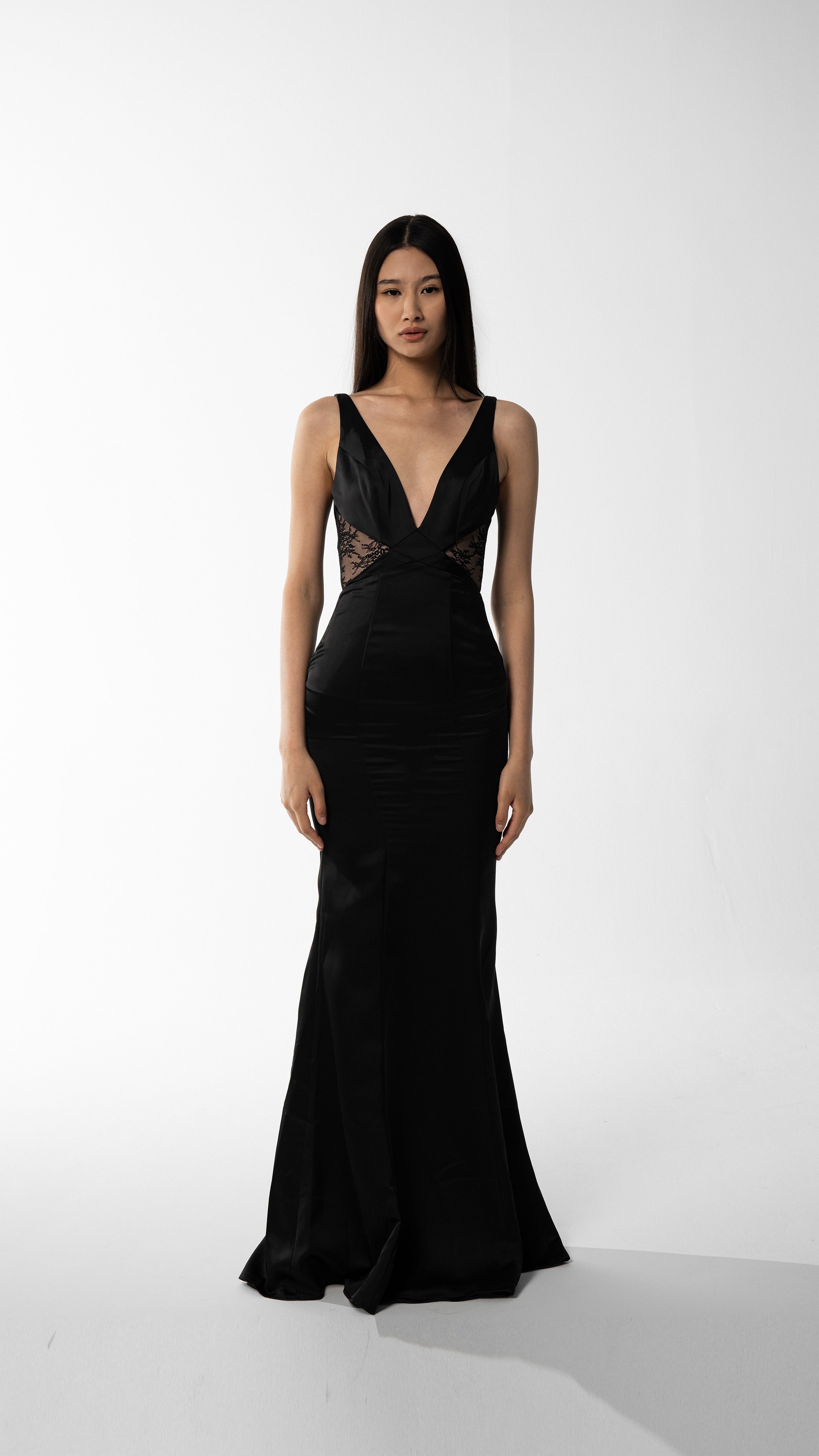 Thoughtfully crafted from black satin and premium lace, this design gracefully embodies the mermaid silhouette, contouring your figure to perfection. Tailored to make you the center of attention, Serena ensures you shine at every occasion.
